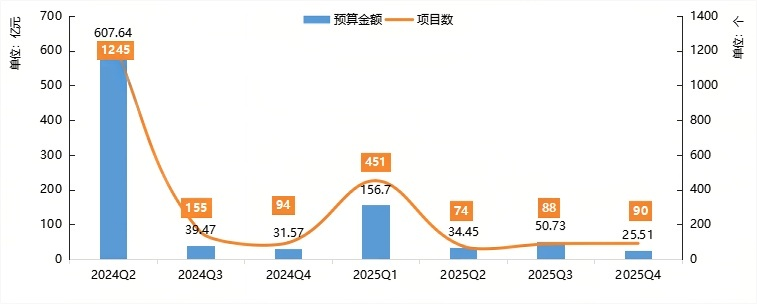 01拟 建 项 目| 1、趋势 截至2025年底,我国医疗领域设备更新拟建项目数量共计2197个,其中1152个项目披露了预算金额,占比约52.4%,披露总预算金额约946亿元,单个项目平均预算金额约8210万元。图 1 2024-2025年我国设备更新拟建项目趋势情况 数据来源:众成数科-医械云标讯MDBIDS| 2、区域分布从省份分布看,2025年全国共有30个省/直辖市/自治区开展了医疗设备