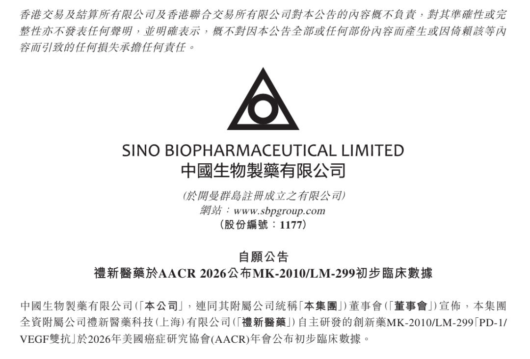 注:本文不构成任何投资意见和建议,以官方/公司公告为准;本文仅作医疗健康相关药物介绍,非治疗方案推荐(若涉及),不代表平台立场。任何文章转载需要得到授权。代表下一代肿瘤免疫治疗方向的PD-1/VEGF双抗赛道,又一“中国创新”重磅创新药披露最新临床数据。4月20日,港股医药龙头中国生物制药公告,正在美国圣地亚哥举行的美国癌症研究协会(AACR)年会上,中生旗下礼新医药的自主研发的创新药MK-201