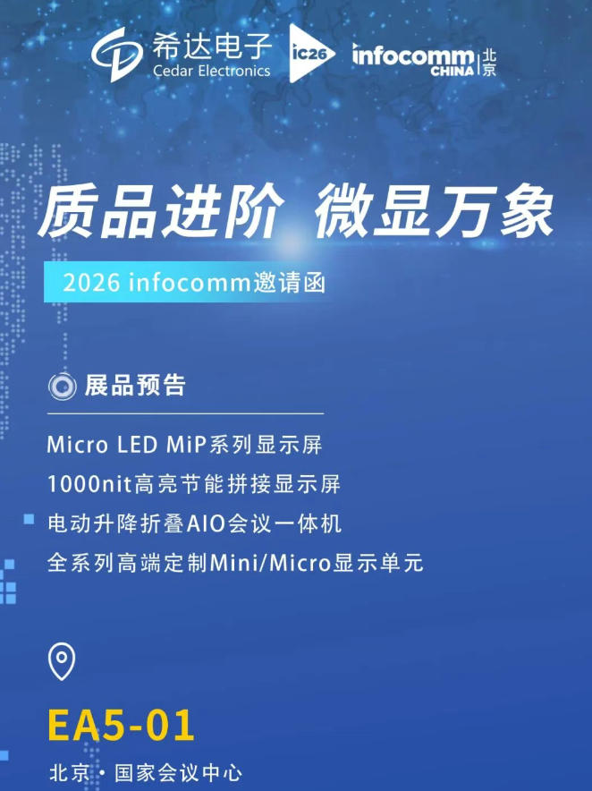 InfoComm China 2026 北京展——作为亚太地区领先的专业视听和集成体验商贸展览会,即将于2026 年 4 月 15 日 - 17 日,在北京国家会议中心举行。 长期以来,这一展会见证了希达的创新与荣光。2026年,希达以「质品进阶 微显万象」为主题,携多款全新升级的重磅显示产品亮相EA5-01 展位,届时,您可以近距离体验产品,对比不同产品性能,在现场与专业技术人员、销售人员洽谈,