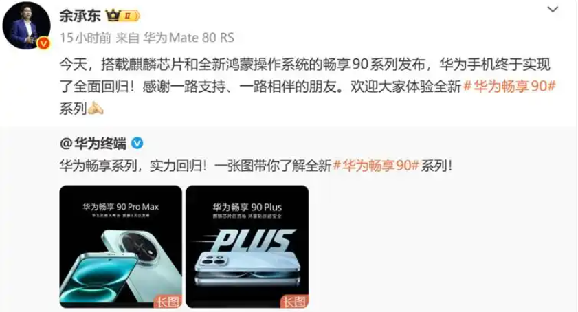 半导体行业圈 振兴国产半导体产业!3月23日,华为常务董事、产品投资评审委员会主任、终端BG董事长余承东发文称:“今天,搭载麒麟芯片和全新鸿蒙操作系统的畅享90系列发布,华为手机终于实现了全面回归!感谢一路支持、一路相伴的朋友”。在华为发布会何刚发布了包括华为Mate80 Pro Max、华为手表、鸿蒙智行汽车等超过20个芯片,但是风头却被一款名为畅享90系列的手机抢了过去。原因无它,因为这款手机