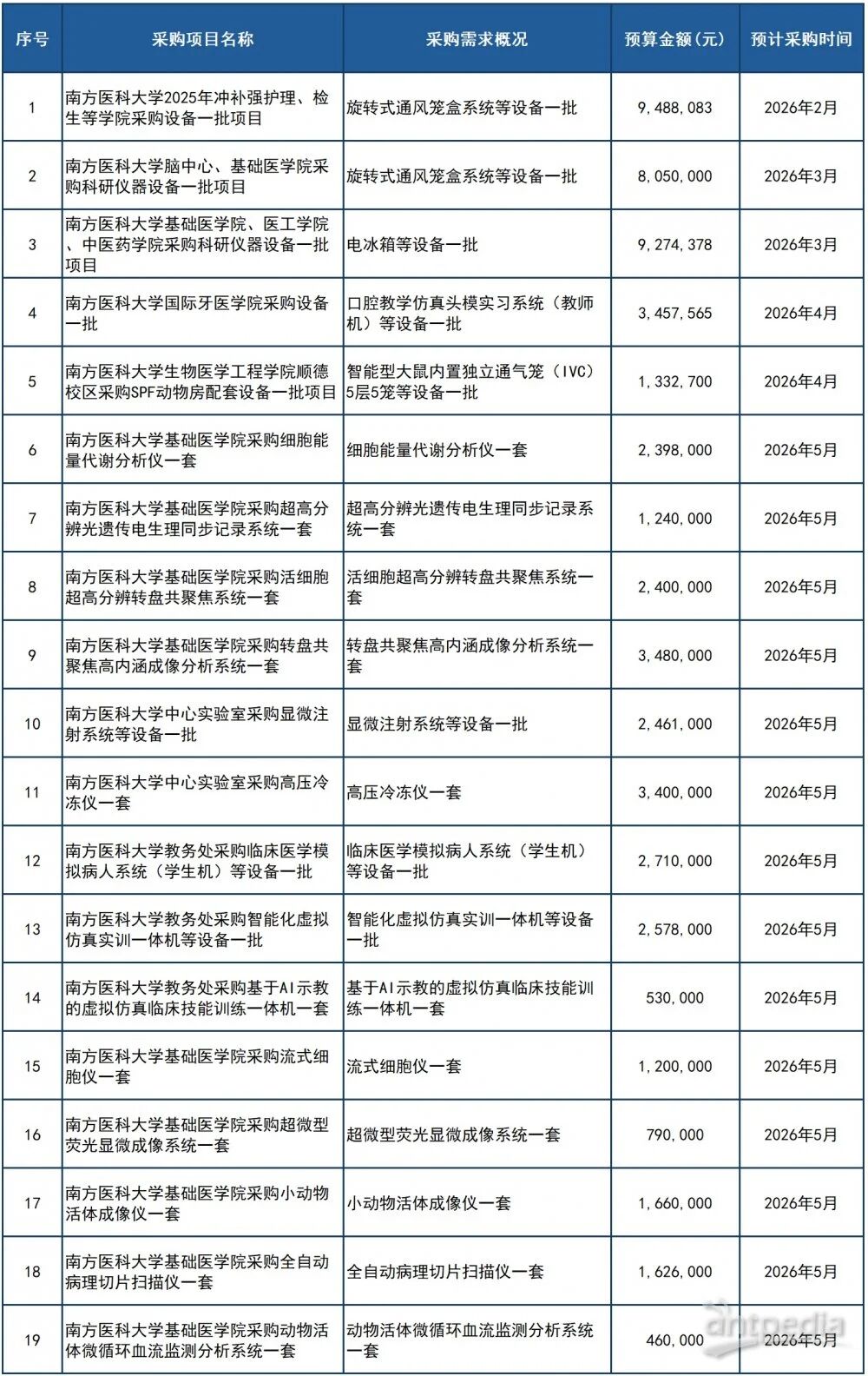 据广东省政府采购网消息,为进一步规范政府采购行为,提高采购透明度,保障供应商合法权益,根据《财政部关于开展政府采购意向公开工作的通知》(财库〔2020〕10号)等有关规定,广东省教育厅近日公布了关于南方医科大学2026年02月至2026年12月的政府采购内容,聚焦教学科研设备升级,全力支撑学校人才培养与科研创新工作。 本次公开的采购意向共19个项目,预算总额超5853万元,覆盖护理、检生、脑中心、