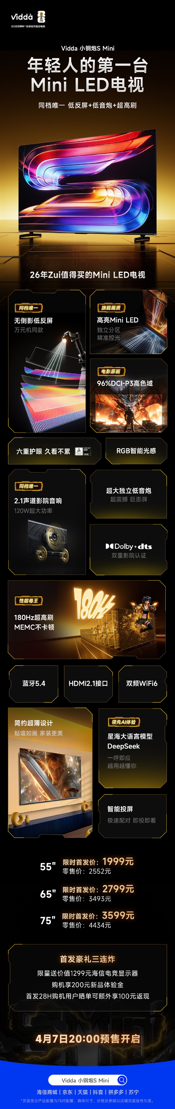 快科技4月7日消息,海信Vidda这次是真的把Mini LED电视的价格打下来了,全新推出小钢炮S Mini系列,首发价只要1999元起,4月7日20:00开启预售。 这款电视主打的就是便宜,55英寸版本首发1999元,65英寸2799元,75英寸3599元,对比同档产品价格优势明显。 核心配置上很能打,采用高亮Mini LED面板,搭配独立分区精准控光,96%DCI-P3高色域覆盖,电影原画级色