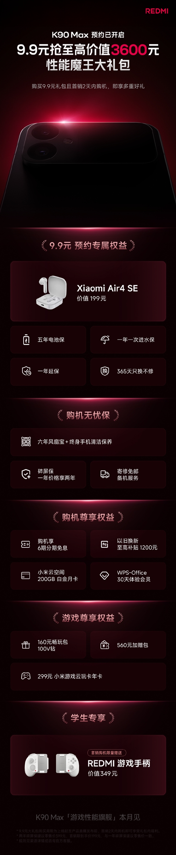 快科技4月7日消息,REDMI K90 Max将于本月发布,新机已在各大电商平台开启预约。 据小米介绍,用户在REDMI K90 Max预约期下单购买9.9元权益包,并于首销期(发布会当日以及后一天)购买REDMI K90 Max新机,且7天内手机无退货的用户,可享价值3600元预约礼包。 9.9元权益包内容:小米Air4 SE无线耳机+1年延保+5年电池保+365天只换不修+1年1次进水保。 R