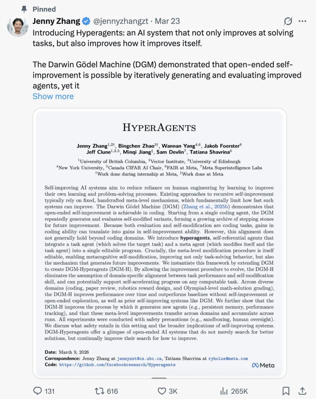 关注后加星: 早上七点钟, 全球AI动态在手中昨日,AI领域发生了多项重要事件和进展,共计约15条汇总如下。AI应用进展和演化1-1. Meta华人实习生搞出超级智能体!自己写代码实现自我进化Meta华人实习生团队提出“超级智能体”(Hyperagents),引发AI界广泛关注。该技术核心是将的“哥德尔机”与达尔文式开放进化结合,打造能自主迭代改进自身算法的AI系统——即“达尔文哥德尔机”(DGM