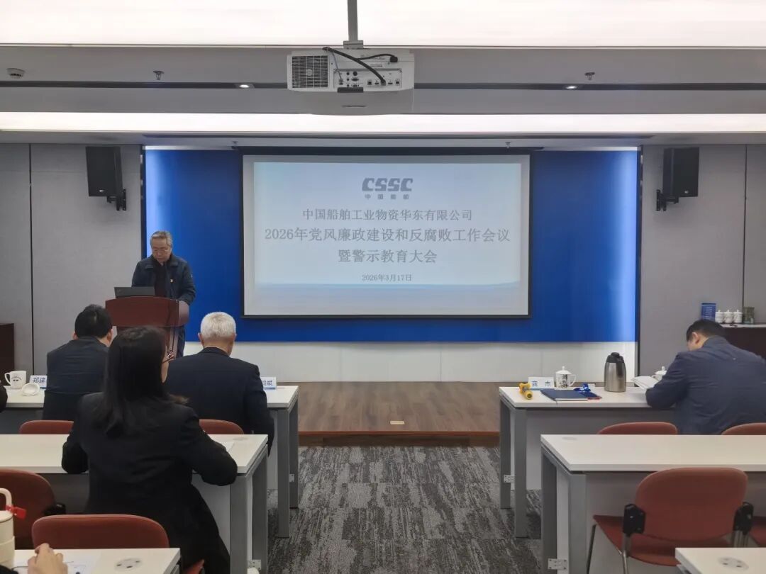 3月17日,中国船舶工业物资华东有限公司召开2026年党风廉政建设和反腐败工作会议暨警示教育大会,总结回顾2025年党风廉政建设和反腐败工作,研究部署2026年党风廉政建设和反腐败工作任务。华东公司党委委员、副总经理(主持行政工作)龚杰主持会议,传达学习上级有关会议精神,纪委书记沈首坤通报违纪违法案件,并作党风廉政建设和反腐败工作报告。党委书记、董事长许鸿斌作总结讲话,公司全体员工参加会议。会议指