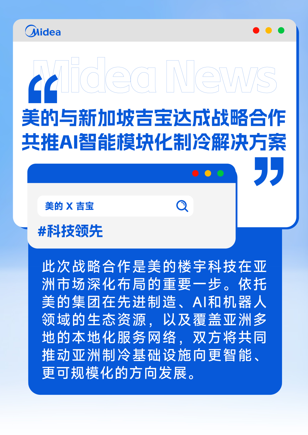 4月13日,美的集团旗下美的楼宇科技与新加坡吉宝有限公司基础设施部正式签署战略合作协议。双方将共同开发面向亚洲市场的AI驱动、节能高效的模块化制冷解决方案,推动制冷行业向智能化、低碳化方向升级。美的楼宇科技在暖通空调制造及智能楼宇系统领域的技术能力,将与新加坡吉宝在“制冷即服务”(Cooling-as-a-Service, CaaS)及数字化优化方面的优势深度融合,共同推动标准化、模块化制冷系统的