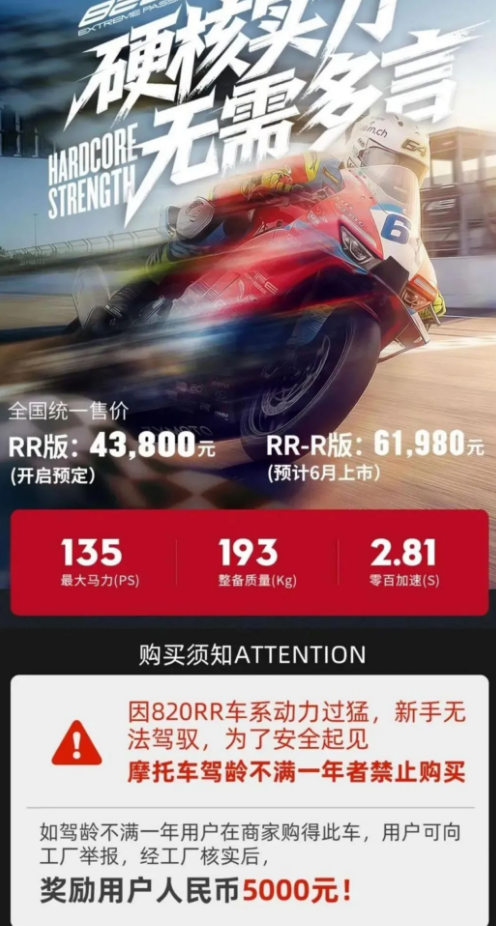 快科技4月1日消息,近日,重庆张雪机车公司因推出“驾龄不满一年者禁止购买大排量摩托车”的规定,被用户投诉至市场监管部门,引发关注。张雪发布的视频显示,其公司工作人员称,当天接到市场监督管理部门联系,因设置禁止驾照一年以内的消费者购买820RR违反了公平交易的原则,要求整改,“如果不整改可能会被处罚”。此事引起关注后,重庆两江新区市场监督管理局工作人员向媒体回应称:这是误读,我们并没有给他下达整改通