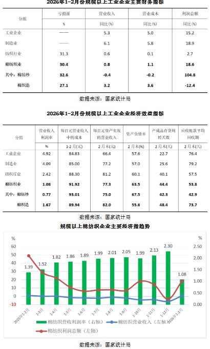 一、棉纺织业——利润同比大幅增长,利润率指标存隐忧 据国家统计局数据,2026年1-2月规模以上棉纺织企业营业收入同比增长0.8%,利润总额同比大增18.6%,两项指标均由上年全年累计下降转为增长,但营业收入利润率仅为1.08%,其中棉纺纱仅为0.77%,低于上年全年累计和上年同期同比数据。 1-2月份,规模以上棉纺织企业与纺织行业企业相比,亏损面低0.9个百分点,营业收入、营业成本及利润总额增长