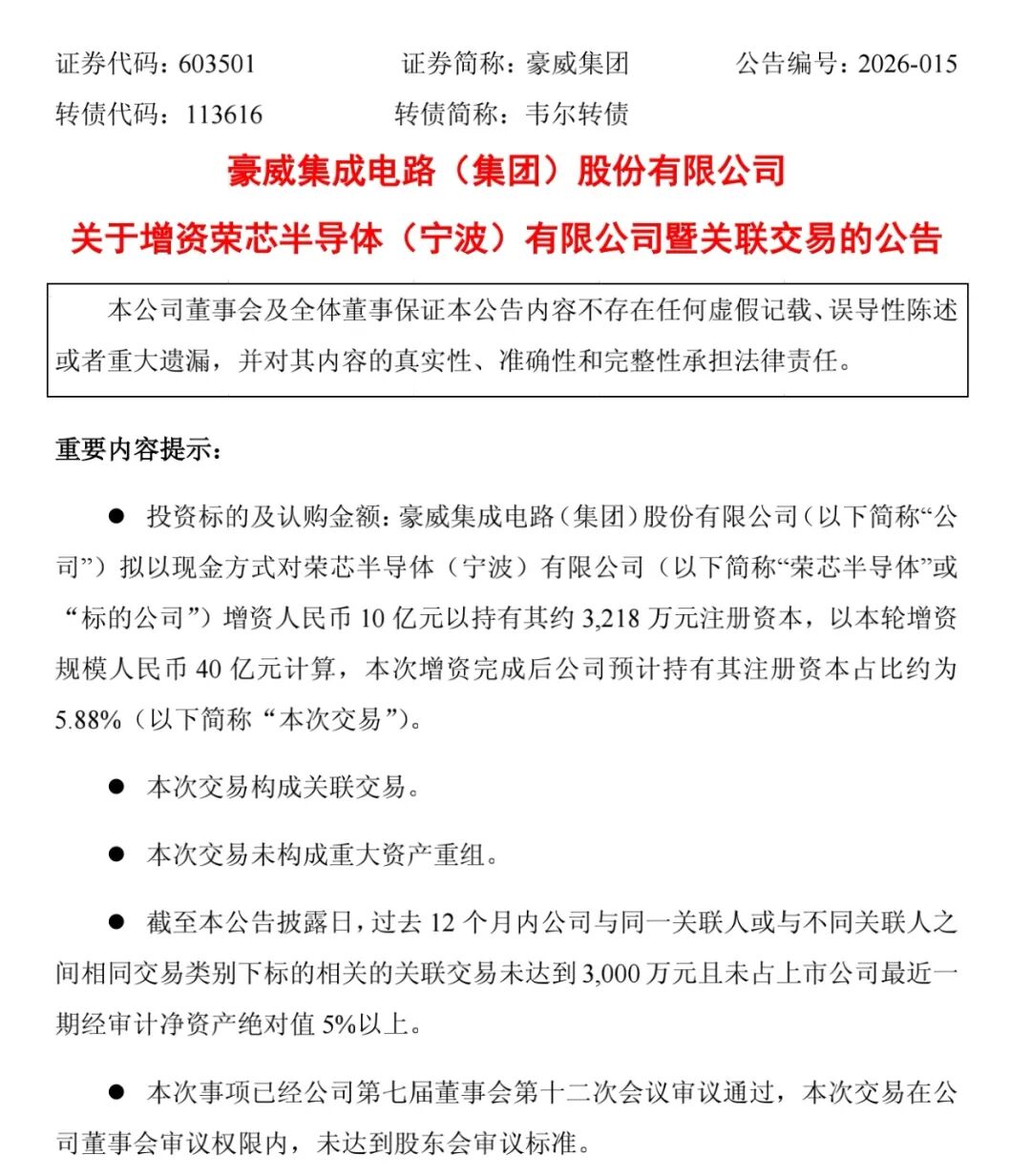 3月20日,豪威集团(股票代码:603501)正式发布对外投资公告,宣布为进一步完善公司半导体全产业链布局,强化与上游供应链环节的深度战略协同,打造具备更强韧性的供应链网络与稳定高效的交付保障体系,公司拟以现金出资方式,对荣芯半导体(宁波)有限公司进行增资,增资金额达10亿元。根据本次交易安排,豪威集团此次10亿元增资,将对应持有荣芯半导体约3218万元注册资本;以荣芯半导体本轮总计40亿元的增资