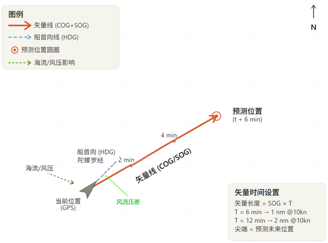 李老师微信 13697601072船舶在航行时,在电子海图和雷达的本船上都有一个矢量线。正是因为船员等船舶操作者司空见惯,天天用,反而可能并没有搞清楚,这个矢量线到底是什么?为此,我花了一个多小时的时间,画了一张很有价值的图,如下所示:本文就用这张图,讲清楚船舶矢量线到底是啥?有人可能说,这个不是太简单了吗?你图上那个橙色的线,就是矢量线,不就是代表船舶的方向吗?确实是方向,但既然是方向,为什么在