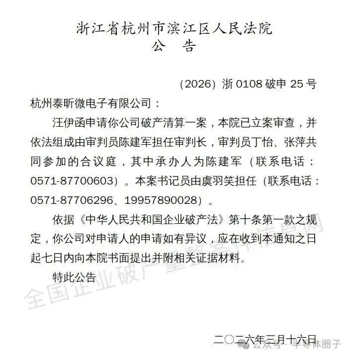 共读好书近日杭州市滨江区人民法院发布破产审查公告,正式受理对杭州泰昕微电子有限公司的破产审查申请,案号为(2026)浙0108破申25号。这意味着这家曾专注于IGBT、SiC功率模块研发的国产芯片企业,已陷入司法程序中的困境,成为国内功率半导体行业整合洗牌期的又一代表性案例。公开信息显示,杭州泰昕微电子成立于2019年,注册资本5000万元,主要聚焦功率半导体领域,以IGBT(绝缘栅双极型晶体管)