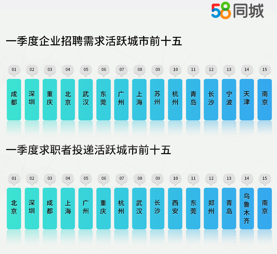 封面新闻记者 付文超今年一季度,在稳就业政策与消费回暖双重驱动下,招聘市场呈现供需两旺的繁荣景象。4月8日,58同城发布2026年一季度的人才流动数据报告。数据显示,北京招聘与求职两端同步升温,成都、重庆、武汉等新一线城市用工需求强劲。随着企业全面复工复产,餐饮、家政等服务消费潜力加速释放,服务员、普工等相关岗位招聘需求稳居前列。数据显示,一季度企业招聘需求环比增长12.5%,求职者简历投递量同步