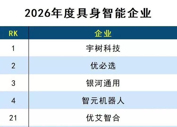近日,德本咨询(DBC)联合中国科学院《互联网周刊》发布《2026人工智能分类排行榜》。凭借在具身智能领域的技术创新和应用落地实践,优艾智合入选“2026年度具身智能企业”,彰显公司在具身智能赛道的行业引领地位。德本咨询分析指出,中国的AI创新,从来不是单一技术的领先性,而是技术与场景的适配能力、全链条的工程化落地能力,以及规模化商业闭环的构建能力。通过构建“技术+场景+产品”三位一体的成长框架,