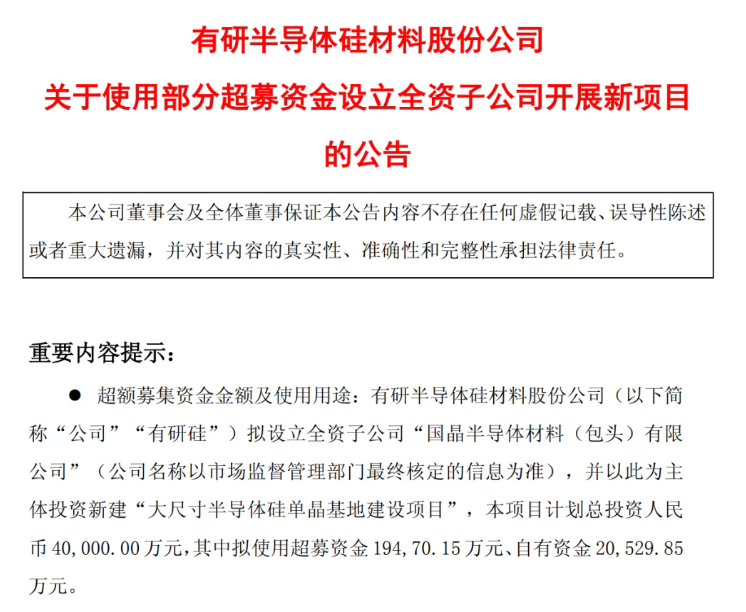 3月20日,有研硅发布公告称,公司拟设立全资子公司“国晶半导体材料(包头)有限公司”,并以该子公司为实施主体,在内蒙古包头投资建设“大尺寸半导体硅单晶基地建设项目”。项目计划总投资4亿元,其中拟使用超募资金1.95亿元,其余2.05亿元由公司自有资金投入。项目预计将于2027年12月达到预定可使用状态。根据规划,该项目将落地于包头稀土高新技术产业开发区,建设约5万平方米单晶生产厂房,配置140个单