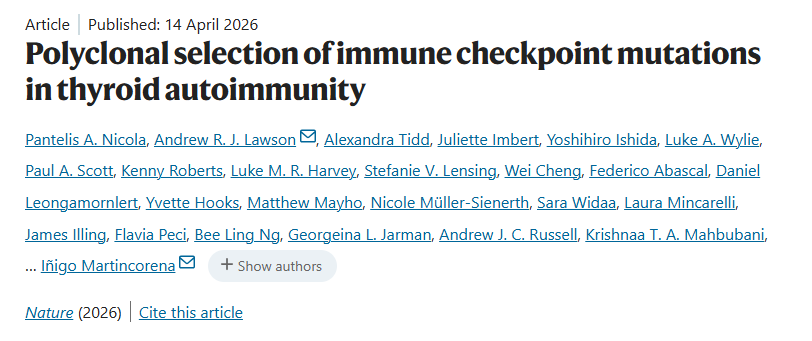 一项新研究表明,自身免疫性疾病可能是由免疫细胞中的DNA突变驱动的,这些突变绕过了免疫系统的天然检查点。这表明体细胞突变在癌症以外的疾病中发挥着此前不为人知的作用。Wellcome Sanger研究所和剑桥大学等机构的研究人员近日利用一系列前沿技术鉴定出此前未发现的DNA突变,这些变化可能导致甲状腺自身免疫性疾病,也就是免疫系统攻击甲状腺。这项研究成果于4月14日发表在《Nature》杂志上,它有