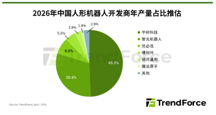 April 9, 2026 ---- 根据TrendForce集邦咨询最新人形机器人深度研究报告,2026下半年全球人形机器人产业将进入商业化的关键期。其中,中国厂商锁定的商用化目标与场景逐渐明确,并积极提升产量,预估将激励2026全年中国人形机器人市场产量年增高达94%。宇树科技、智元机器人凭借盈利能力与量产进度,在激烈竞争中脱颖而出,预估两者合计将囊括近80%的出货占比。 TrendForce