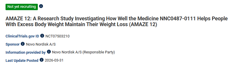 3月31日,美国临床试验收录网站显示,诺和诺德在超重人群中启动了Zenagamtide(Amycretin,NNC0487-0111)的首个III期临床试验(AMAZE 12)。Zenagamtide是一种单分子激动剂,作用于胰高血糖素样肽-1受体(GLP-1R)和胰淀素受体(AMYR),适用于每周1次皮下注射给药和每日1次口服给药。AMAZE 12是一项全球性、多中心临床试验(n=600),旨在