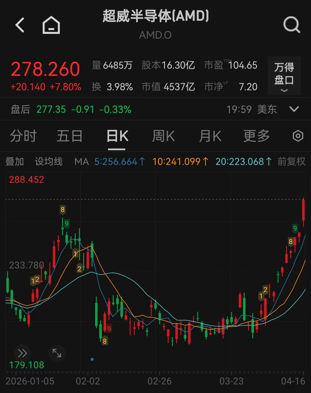 美股4月16日,AI芯片厂商AMD(AMD.O)涨7.8%,收盘278.26美元/股,股价创历史新高,市值达到4537亿美元。 AMD股价已连涨12个交易日,创下2005年以来最长的连涨纪录。3月31日至4月16日,AMD股价累计上涨41.94%,市值上涨超1200亿美元。 AMD的业务包括GPU和CPU,此前GPU作为一种AI加速芯片,被视为对CPU在计算机中核心地位的颠覆,但近期CPU的价值受