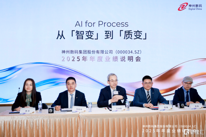 4月2日,神州数码(000034.SZ)举办2025年度业绩说明会。神州数码联席董事长王冰峰携更趋年轻与专业化的新管理团队亮相,解读2025年度业绩和战略落地亮点,并首次披露神州数码紧抓AI时代机遇,深度践行"AI for Process"的新战略布局,进一步夯实转型增长新引擎。AI相关业务强劲驱动,稳健经营,加速穿越周期说明会现场,神州数码财务总监李京对2025年整体经营情况作了进一步解读。20
