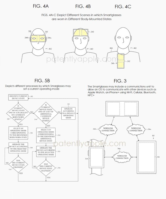 编译/VR陀螺 近日,美国专利商标局(USPTO)公布一份苹果新专利,显示其为智能眼镜提出了一套可感知使用状态的运行机制。系统会根据眼镜佩戴的位置、佩戴方式,甚至用户摘下眼镜的方式与放置位置,来持续重新配置设备功能。这份专利文件描绘了这样一个未来:智能眼镜可自动切换工作模式,例如从沉浸式显示设备,变为佩戴在躯干上的传感器,再转为近距离“防丢寻物”信号发射器,全程无需用户手动切换模式或进入设置操作。