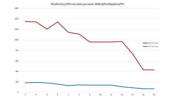 博主TechEpiphany近日发出感叹:“追踪零售CPU销量10年来,我从未见过如此急剧的下跌。TechEpiphany长期跟踪Mindfactory、Amazon等多家零售商的CPU、GPU和主板周销量数据,其10年数据积累让这一判断颇具分量。 数据显示,从今年第3周到第15周,Mindfactory的AMD和Intel处理器销量持续走低,趋势线几乎呈直线下降。 暴跌的背后是内存和存储价格的失