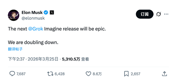 快科技3月27日消息,据媒体报道,埃隆马斯克(Elon Musk)周三表示,其人工智能公司xAI计划升级AI视频生成器,以抓住竞争对手OpenAI本周停用Sora产品所留下的市场空白。马斯克当天在X上发文称:下一版Grok Imagine的发布将会非常震撼,我们正在加倍投入。”马斯克还分享了一系列由Grok聊天机器人生成的AI视频,试图通过帮助用户快速创建逼真的图像和视频等功能,与ChatGPT及
