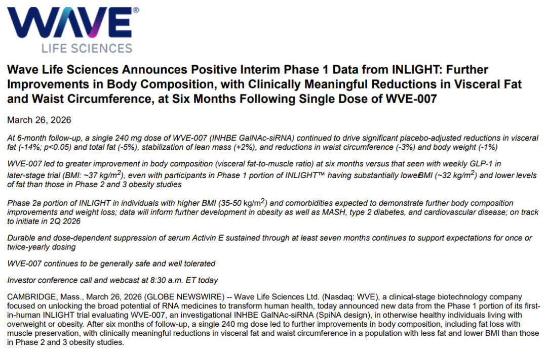 ▎Armstrong2026年3月26日,Wave Life Sciences公布INHBE siRNA新药WVE-007一期临床最新数据。240mg WVE-007单次给药3个月内脏脂肪减少7.8%,6个月减少14.3%,总脂肪分别减少5.1%、5.3%,肌肉增加2.2%、2.4%。400mg WVE-007单次给药3个月内脏脂肪减少5.0%,总脂肪减少0.7%,肌肉减少0.2%。Wave Li