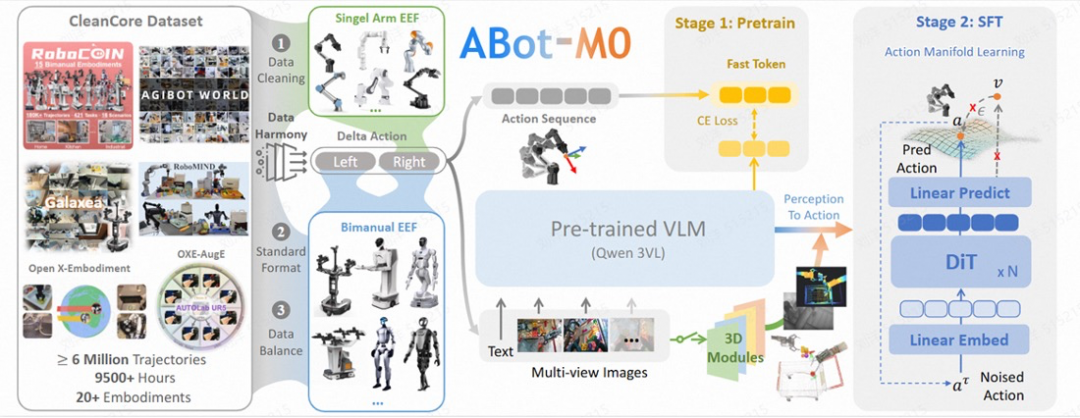 【TechWeb】3月31日消息,近日,高德宣布正式全量开源具身操作基座模型ABot-M0,该模型可实现一个“通用大脑”适配多种形态的具身机器人。此次ABot-M0的开源涵盖数据、算法与模型三大维度。数据层面,ABot-M0开源了目前规模最大的通用机器人数据集UniACT,整合超过600万条真实操作轨迹,并提供从原始异构数据到标准化训练数据的全流程处理管线。算法层面,ABot-M0同步开源了模型架