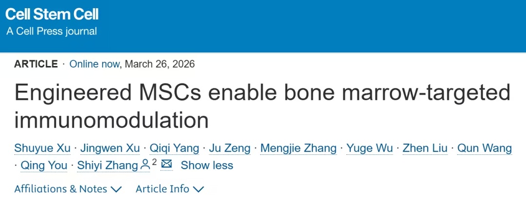 肿瘤越来越多地被认为是全身免疫失调的结果,而目前的治疗方法只关注直接杀死肿瘤或局部免疫激活,忽视了使肿瘤发生和转移的全身免疫景观。靶向远端免疫器官,如骨髓(BM),而不干扰肿瘤仍然具有挑战性。 2026年3月26日,上海交通大学张诗宜团队在Cell Stem Cell(IF=20.4)在线发表题为Engineered MSCs enable bone marrow-targeted immunom