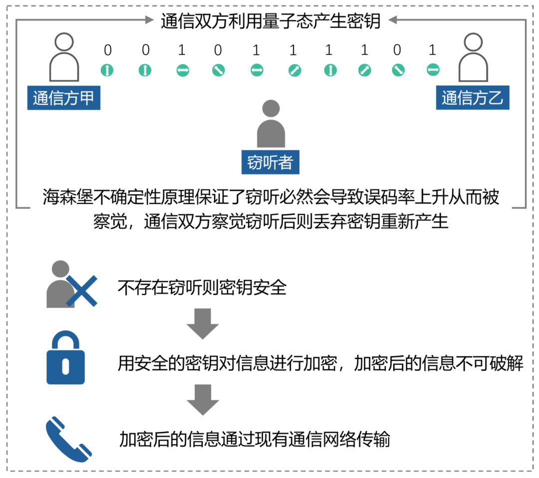 QKD的安全性基于量子力学的基本性质,与任何计算假设无关。结合QKD和“一次一密”,密文的安全性已经得到了信息学层面的严格证明,是迄今唯一达到“信息论可证”安全的通信方式,即使是量子计算机也无法破解。