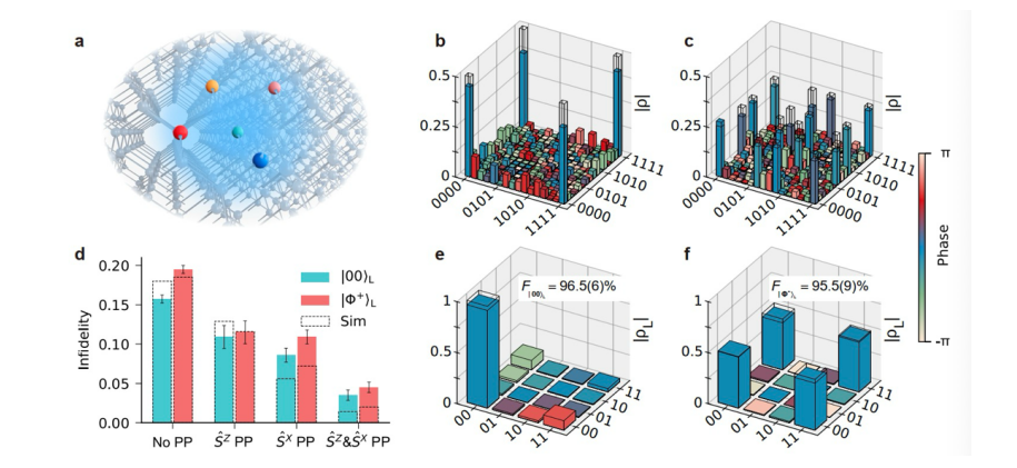 研究团队利用扫描隧道显微镜氢掩膜光刻(STM-HL)技术,以原子级精度加工了硅基量子处理器。团队设计的磷原子团簇量子计算架构,可以实现物理比特的良好寻址和全联通的高效多比特门,同时开发了抑制串扰的方案,为高保真操控提供了基本保障。团队采用高效的[[4,2,2]]量子错误探测码,在四个物理核自旋上编码了两个逻辑量子比特。[[4,2,2]]码是构建容错逻辑量子比特的最小单元之一,可作为未来大规模级联纠错架构的关键基础模块。