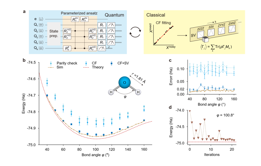 为展示该量子处理器的实用潜力,团队在国际上首次于硅基逻辑量子比特上完成了量子算法演示并求解实际问题。团队在两个逻辑量子比特上成功运行了“变分量子本征求解”算法,精确计算了水分子(H₂O)的电子基态能量,计算结果与理论值误差仅为20 mHa,未来有望进一步达到化学精度要求。这充分证明了该逻辑编码方案运行实用量子算法的可行性。