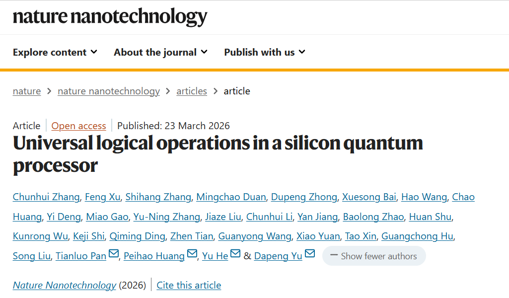 相关成果以“Universal logical operations in a silicon quantum processor”为题,于2026年3月23日在国际权威学术期刊《自然·纳米技术》 (Nature Nanotechnology)上在线发表。