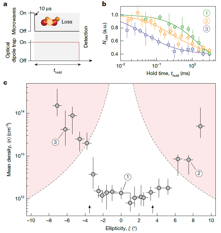 密度的测量结果显示,在形成的单液滴态中,分子气体的平均密度发生了急剧的增加。相比于初始的微波屏蔽玻色爱因斯坦凝聚体,液滴态的密度提高了两个数量级,达到了约1014cm−3 的水平。在如此致密的状态下,偶极相互作用的特征长度已经达到甚至超过了粒子间的平均几何间距,这表明该分子气体系统已经进入了强相互作用区间。同时,即使在最高密度的液滴态下,分子气体的寿命依然远长于偶极相互作用的特征时间尺度。