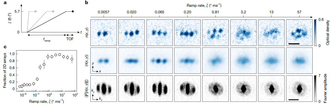当相互作用的建立速率缓慢时,系统具备充分的时间弛豫,演化过程处于近绝热状态。在这种状态下,分子气体通过空间密度的有序重分布,形成了稳定的一维液滴阵列。实验结果表明,这种一维阵列中的液滴数量和液滴间距在多次重复实验中保持高度一致,证实了系统此时处于多体稳态。在飞行时间观测期间,阵列中的单个液滴维持自身体积不变,但由于相邻液滴之间存在相互排斥的偶极力,它们在空间上会随时间推移逐渐分离。相反,当相互作用的建立速率较快时,系统演化偏离了绝热条件,外部微波电场参数的快速变化使得系统无法在短时间内达到新的能量稳定点。这种包含激发的非平衡态制备过程导致系统内部产生了强烈的空间和密度涨落,在宏观上表现为液滴数量和空间位置存在显著随机性的二维液滴阵列。