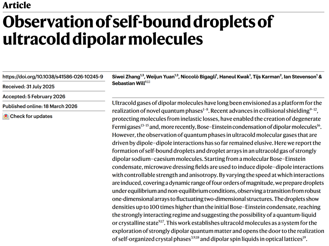 近日,哥伦比亚大学 Sebastian Will 团队以超冷强偶极钠铯分子的玻色爱因斯坦凝聚体为起点,利用微波场精准诱导并调控分子间的长程电偶极相互作用。他们首次在该分子系统中观测到了自束缚的单液滴及液滴阵列,并通过改变相互作用的建立速率,揭示了系统从一维稳定阵列向二维涨落结构的动力学演化过程。测量结果显示,液滴内部的局部密度比初始凝聚体高出百倍,标志着该超冷分子系统成功进入强相互作用区间,为未来探索新型偶极量子物态提供了全新的实验平台。相关成果于3月18日发表于国际权威学术期刊《自然》 [Nature 651, 601 (2026)]。