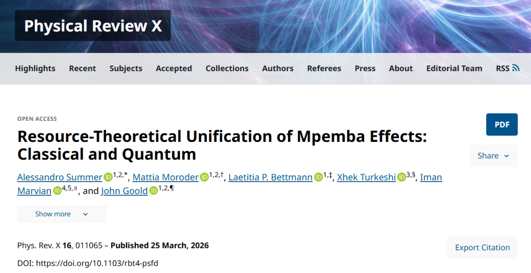 本研究利用信息论中的资源理论为姆潘巴效应提供了一个统一的组织原则:通过证明传统的热姆潘巴效应源于“非热性”资源理论,而量子对称性恢复则由“不对称性”资源理论捕捉,揭示了这类效应本质上受控于初始状态与系统最慢弛豫模式之间的重叠程度。该框架成功将看似无关的经典热力学与量子动力学现象联系起来,并将热化动力学清晰地划分为对称守恒项与对称破缺项。研究成果于3月25日发表于《Physical Review X》(物理评论X)。
