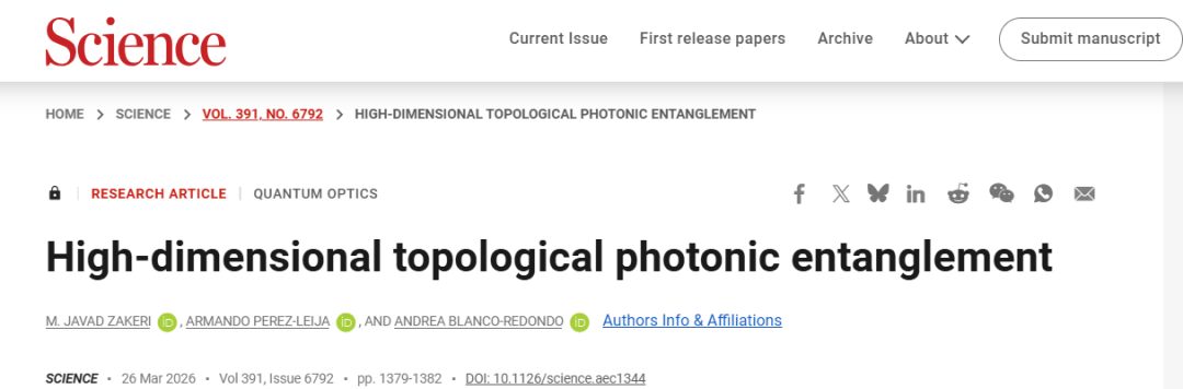 高维量子态是量子计算与通信的核心资源,拓扑保护可提升其抗噪性,但大规模拓扑光子纠缠的实现路径缺失。本研究基于硅光子波导拓扑超晶格,非线性产生能量-时间纠缠光子对,实现最多5个拓扑模式的高维纠缠,且对纳米加工缺陷具有鲁棒性。该成果突破了拓扑光子模式的纠缠扩展瓶颈,为可扩展、容错的量子光子态提供了实验路径,支撑高维量子计算、长距离量子通信等应用,推动拓扑光子学与量子信息的交叉融合。研究成果于3月26日发表于《Science》(科学)。