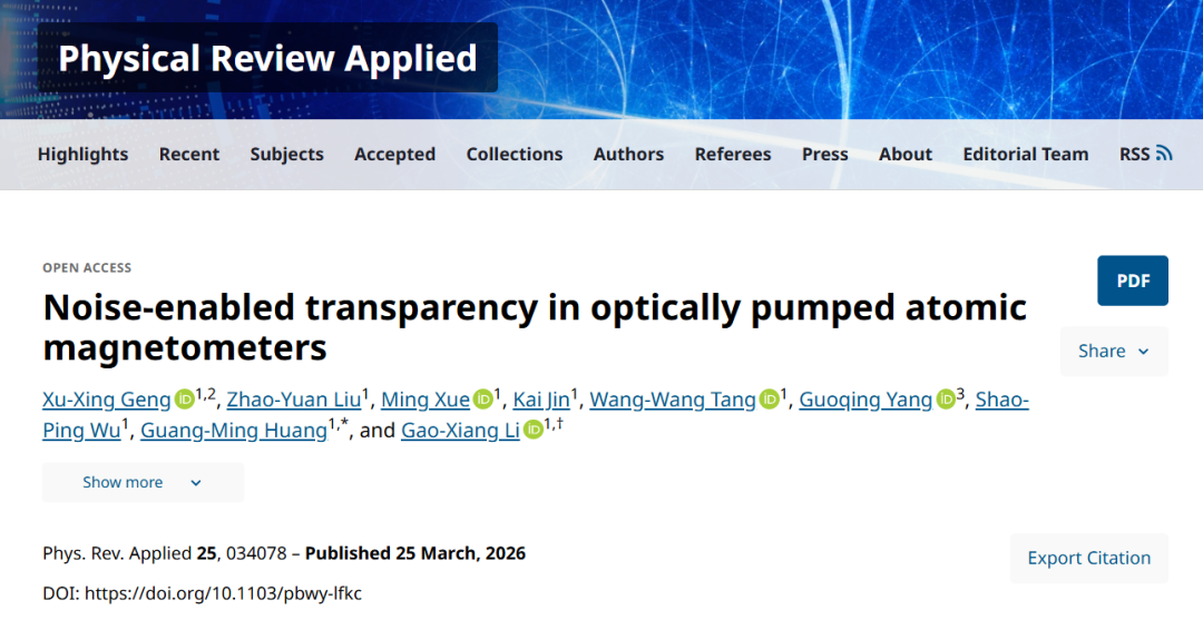 本研究在光泵浦原子磁强计中,实现Σ型与Λ型噪声诱导透明(NIT)效应,揭示其源于自旋随机跃迁通道的干涉。Σ型构型中,RTN驱动谱分裂使透明窗口显著变化,关联动态临界性与谱结构;Λ型构型中,振幅依赖噪声干涉使透明效应在弱噪声下稳定,提供可校准的噪声振幅读出。该成果将磁强计光谱从噪声抑制拓展至“以噪探噪”,为非高斯噪声测量与自适应背景噪声传感提供新范式。研究成果于3月25日发表于《Physical Review Applied》(物理评论应用)。