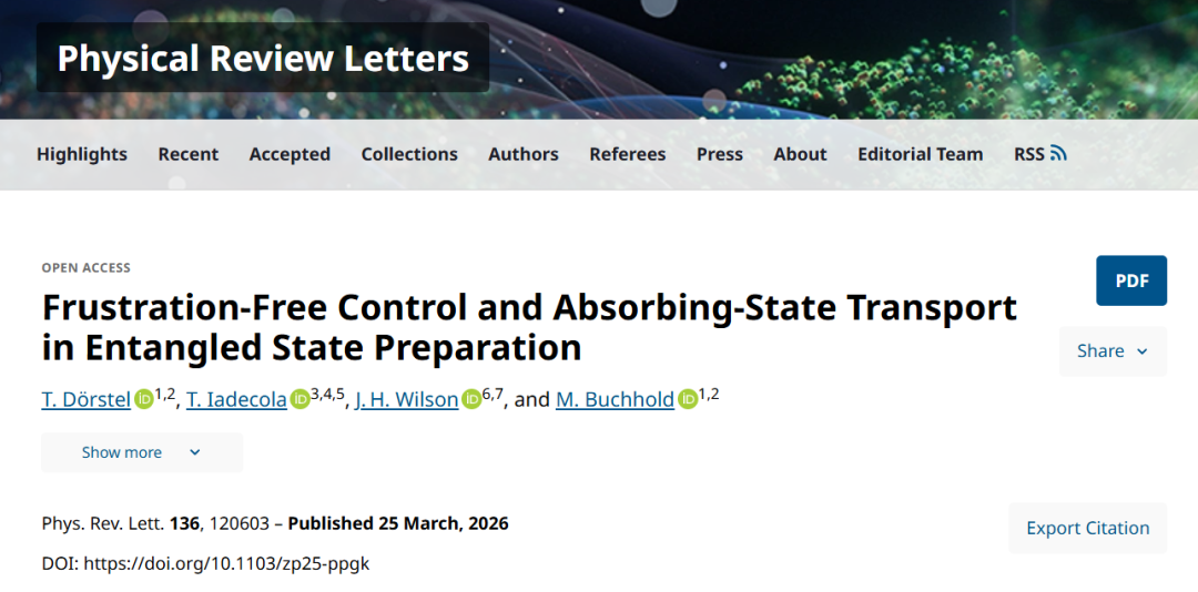 本研究提出无阻挫控制框架,通过测量反馈与最小局域幺正修正,实现无需后选择的吸收态动力学,将多体系统驱动至目标纠缠态。研究揭示,向目标态的弛豫由非局域电荷的涌现输运主导,测量与乱序幺正决定收敛时间。基线模型映射至吸收随机游走得到t∼L2标度,数值模拟揭示亚扩散z≥8/3行为,证实吸收态输运是受监控量子动力学中确定性纠缠态制备的普适原则。研究成果于3月25日发表于《Physical Review Letters》(物理评论快报)。
