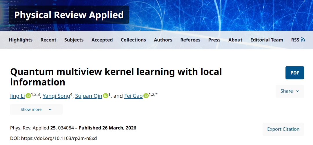 本研究提出融合局部信息的量子多视图核学习(L-QMVKL),构建视图特定量子核融合跨视图信息,通过顺序训练策略与混合全局-局部核对齐优化参数。通过在Mfeat数据集上的数值模拟验证,L-QMVKL实现显著精度提升,且与经典方法相比具有竞争力。该方法突破了单视图与全局依赖的局限,为量子核学习处理复杂多视图数据提供了新路径,推动了量子机器学习的理论与实用化发展。研究成果于3月26日发表于《Physical Review Applied》(物理评论应用)。