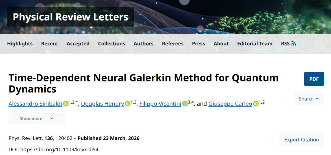本研究提出时变神经伽辽金方法,通过全局变分原理最小化薛定谔方程损失函数,计算完整态轨迹。该方法采用时不变神经量子态的线性组合参数化,适合长时间演化并可量化误差。在一维与二维横场伊辛模型的量子猝灭模拟中,揭示了二维系统遍历性破缺与无热化特征。该方法性能比肩最先进时变变分方法,为强相互作用量子系统的动力学研究提供了新工具,支撑量子计算与基础物理研究。研究成果于3月23日发表于《Physical Review Letters》(物理评论快报)。