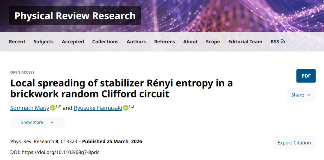 本研究聚焦于量子计算的核心资源——非稳定器性。研究人员利用稳定器瑞尼熵(SRE)作为衡量指标,探索在砖块结构随机克利福德电路中,局部产生的“魔力”是如何随时间演化的。研究发现,在具有随机Haar局部克利福德门的电路中,尽管缺乏显式的守恒荷,但归一化的单比特SRE在弹道光锥内表现出了扩散性结构;而在受限的克利福德电路中,则呈现出超扩散演化特征。此外,研究还证实了“魔力稳健性”这一指标也存在类似的非弹道式演化规律,为理解多体量子系统中的非稳定器资源动力学提供了重要见解。研究成果于3月25日发表于《Physical Review Research》(物理评论研究)。