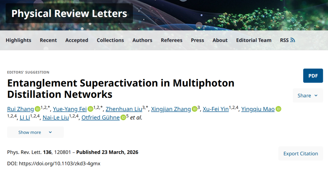 本研究开发了一种基于八光子量子平台的分布式纠缠提纯方案,首次在实验中观测到多体系统中特有的“纠缠超激活”现象——即通过局部操作和经典通信(LOCC),成功从两个无法直接利用的初态中提取出高品质的三光子真多体纠缠态及EPR对,为提升量子网络性能及理解复杂纠缠结构提供了关键路径。研究成果于3月23日发表于《Physical Review Research》(物理评论研究)。