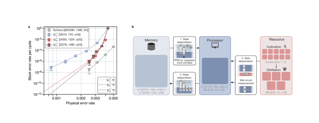 研究团队特别优化了提升乘积(LP)码的家族,可在1个码块内编码1000+逻辑量子比特。数值模拟显示,在0.1%的物理错误率下,最大码距的码块每周期失败率低至10⁻¹¹——相当于每运行一亿次操作,预期错误不到一次。