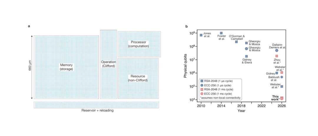 图:中性原子容错量子计算机架构与Shor算法物理量子比特需求演进