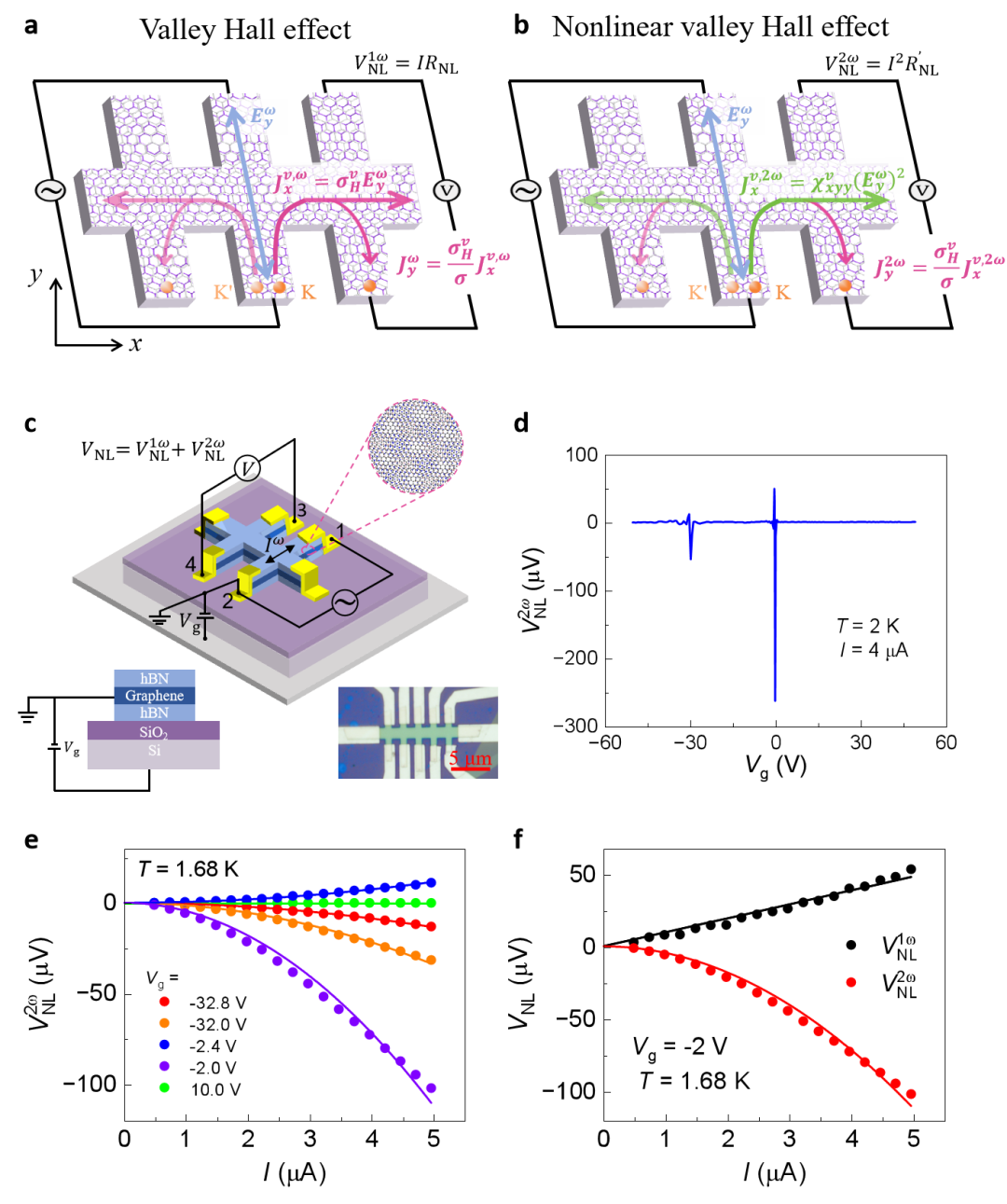 石墨烯/hBN莫尔超晶格中的非线性谷霍尔效应。a, 线性谷霍尔效应及非局域测量的示意图。施加交流电场Ewy 时,谷霍尔效应产生与Ewy呈线性响应的横向谷流Jwx,该谷流通过逆谷霍尔效应转换为电流Jwy,表现为可探测的非局域电压VwNL 。b,非线性谷霍尔效应及非局域测量的示意图。非线性谷霍尔效应产生与Ewy呈二次方响应的横向谷流J2wx ,该二倍频谷流通过逆谷霍尔效应转换为电流J2wy ,表现为可探测的非局域二倍频电压V2wNL 。 K 与 K' 为石墨烯莫尔超晶格能带中两个不等价的能谷。线性谷霍尔响应 (a) 和非线性谷霍尔响应 (b) 分别由粉红色和绿色箭头表示。c,石墨烯/hBN莫尔超晶格器件结构和电学谐波测量示意图。通过电极1和2施加交流电流,并通过电极3和4同时测量一倍频和二倍频电压信号。插图为样品结构侧视图和器件的光学显微镜照片。d,非局域二倍频电压随栅极电压的变化。该信号主要存在于石墨烯能带的狄拉克点附近,并在狄拉克点处发生符号反转。e,不同栅压下非局域二倍频电压随电流的变化关系。f,在石墨烯主狄拉克点附近,非局域二倍频电压显著大于非局域一倍频电压的实验数据。