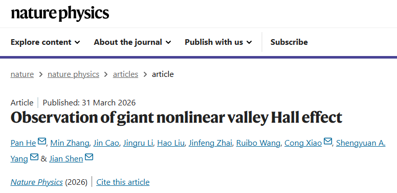 合肥国家实验室/复旦大学沈建及其同事何攀等组的研究团队在量子物理前沿领域取得重要突破。团队成功观测到巨大的非线性谷霍尔效应,并提出了全新的量子器件概念。该成果以“Observation of giant nonlinear valley Hall effect”为题,于2026年3月31日在国际权威学术期刊《自然·物理学》(Nature Physics)上在线发表。