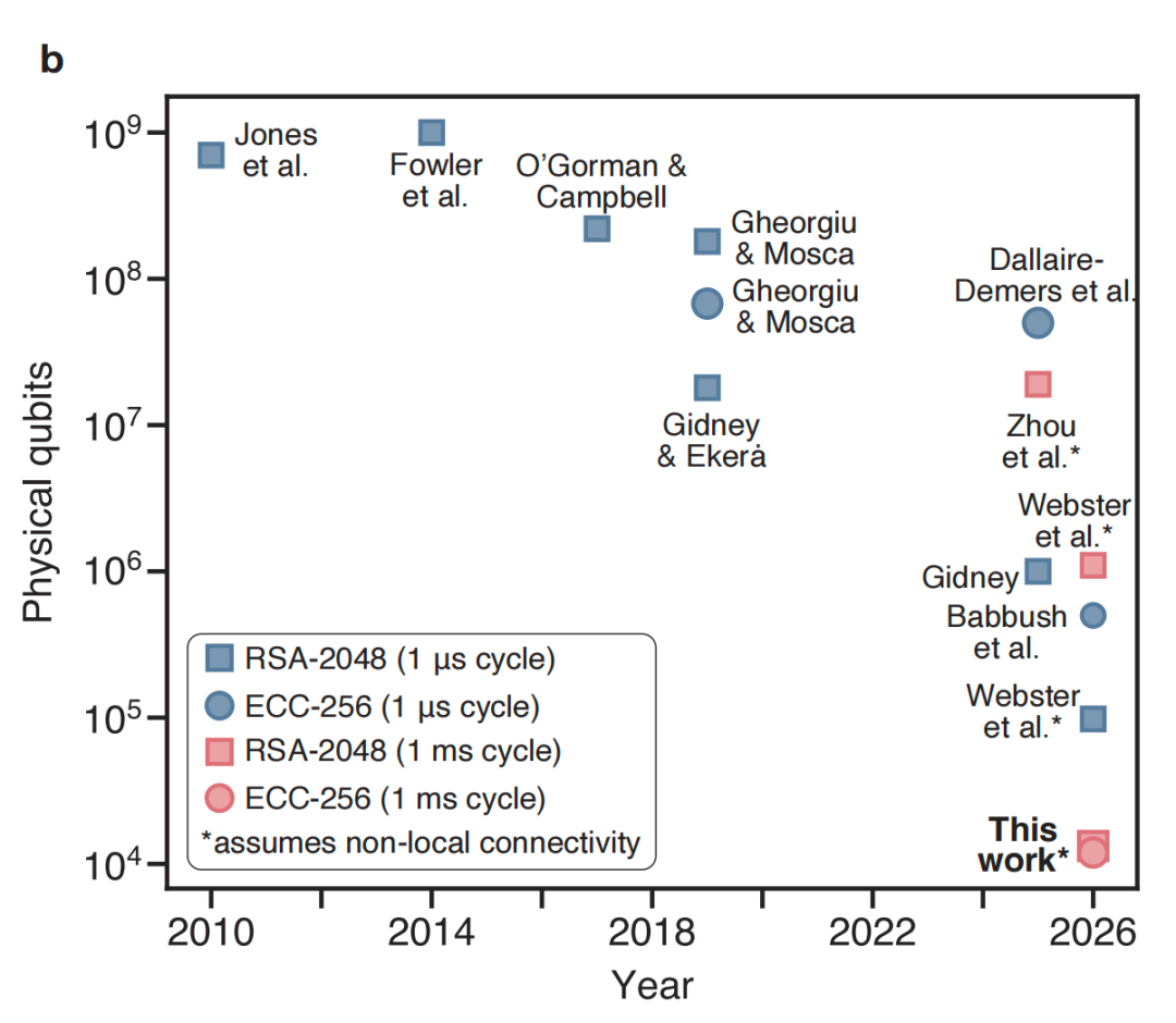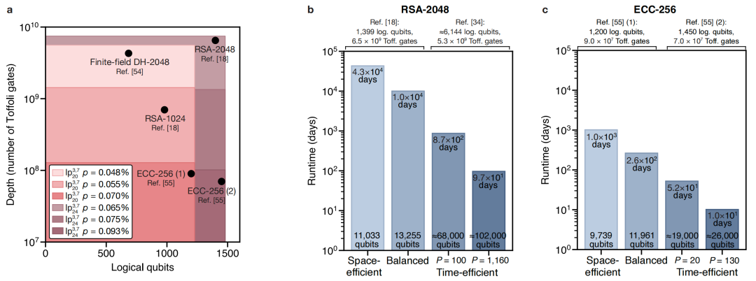 如果用一句话概括这篇论文最扎实的贡献,那不是“1 万比特”,而是它把量子破解密码所需的规模,从“百万级”压到了“万级”。这听起来像是一次简单的优化,但实际上,它改变的是一个长期被默认的前提。在过去十多年里,学界对肖尔算法(Shor's algorithm)的主流判断非常一致:如果要在现实密码规模(如 RSA-2048)上运行,需要上百万个物理量子比特。这个数量级之所以被认为“合理”,不是算法本身复杂,而是因为量子系统太容易出错,必须用大量冗余来纠错。在传统方案中,一个“可用的逻辑比特”,往往需要数百甚至上千个物理比特来支撑,而这篇论文真正做的,就是在这一点上动刀。一方面,它采用了一种更高编码效率的纠错方法(qLDPC)。如果把传统方案比作“用很多备用零件保证机器不坏”,那么这种新方法更像是用更聪明的结构,让同样的可靠性,用更少的冗余实现。另一方面,它结合了中性原子系统的一个关键特性:量子比特可以被“移动”和“重排”,从而实现更灵活的连接关系。这听起来是个细节,但在量子计算中非常关键,因为很多高效编码之所以用不了,正是因为它们需要“远距离连接”。而这种架构,恰好让这些原本“难以计算”的编码,变得“可以用来计算”。当这两点结合在一起时,带来的就不再是渐进优化,而是对资源需求的一次整体重估。不同发表年份下运行Shor算法所需物理量子比特数量的估计(对比既有研究与本文结果):图源论文从“百万级”到“万级”,意味着什么?不是“更容易一点”,而是从“几乎不可想象的工程规模”,进入“可以被认真讨论的范围”。这也是为什么这篇论文在专业社区内部,会被当作一个重要进展来看待:它改变了问题的尺度。很多人看到论文中的“1 万量子比特”,很容易产生一种直觉:这不过是把今天的量子芯片,从几百、几千比特,继续往上扩展一到两个数量级。但是,论文中的“1 万比特”,其实指向的是一件完全不同的东西。它不是“更多的量子比特”,而是一整台已经可以稳定运行复杂算法的容错量子计算机。换句话说,这个数字隐含的前提,并不是“规模更大”,而是系统已经完成了一次质变:这些条件在论文中被一笔带过,但在现实中,它们恰恰是最难跨越的门槛。一个直观的类比是,今天的量子计算如果是“可以飞几秒钟的实验飞行器”,那么论文中的“1 万比特系统”,已经是“可以跨洲飞行的客机”。两者的差别,不在于“发动机再大一点”,而在于是否具备完整、可靠、可持续运行的系统能力。因此,论文真正回答的问题是:“一台成熟的量子计算机,需要多大规模?”如果忽略这一点,“1 万比特”就会被误读成一个即将到来的技术节点,仿佛只要继续堆叠 qubit 数量,就能自然抵达。可现实却是,从“能控制量子比特”,到“能用它稳定计算”,中间隔着一整套尚未完成的工程体系。即便我们暂时接受论文的前提,假设真的可以用约 1 万量子比特来运行 Shor 算法,问题也并没有结束。限制它进入现实世界的,还有另一件更直接的事情:时间。在论文中,那些约束更严格、结构更完整的方案给出的结果其实并不“惊艳”:这些数字的意义,不是“慢”,而是已经慢到失去现实应用意义。现代密码系统的安全性,并不要求“永远无法破解”,而是要求在可预见的时间窗口内无法被破解。一旦计算时间本身就达到数年甚至数十年,那么即使算法在理论上可以完成,它也不会构成实际威胁。因为在结果出来之前,密钥早已更新,系统早已替换。因此,这些方案更接近于一种“原则上可行”的证明,而不是“现实中可用”的能力。同时,这也揭示了一个经常被忽略的关键区别:“能运行 Shor 算法”与“能够破解密码”,中间隔着的除了技术细节,还有时间是否在有效区间内。如果时间不可接受,那么规模再小,理论再优,也无法改变一个事实:这台机器,依然无法在现实世界中完成它被期待完成的任务。如果说“1 万比特”只是让人重新评估规模,那么真正让这篇论文引发轰动的,是另一个更具冲击力的结果:在优化架构下,可以在约 10 天量级破解 ECC。这个结论的重要性不言而喻。它意味着,一旦时间瓶颈被打破,量子计算将从“理论可行”跃迁为“现实威胁”。但也正因为如此,这一结果最容易被误读。一个关键但常被忽略的事实是:这个“10 天结果”,并不来自前面那套相对完整、约束更严格的架构,而是依赖论文中另一条更激进的路径,可以理解为一套“加速版本”。换句话说,论文实际上做了两件不同的事:一条路径,证明“可以用更少的比特完成计算”;另一条路径,尝试证明“可以用更短的时间完成计算”。“10 天”这个数字,属于后者。这条加速路径的核心思路并不复杂:通过大规模并行,把原本需要逐步执行的计算压缩到更短时间。为此,它依赖了一整套能力:理论层面,这些方向都是成立的,也是当前量子计算研究的重要方向。可问题在于,这些能力,目前并没有在同一系统中被完整实现。这意味着,这条路径当前的状态更接近于“如果这些工具都具备,可以达到的性能上限”,而不是“沿着现有技术路线即将实现的能力”。换一个更直观的理解方式就是,前面的结果是在回答“这件事需要多大的机器”,而这一部分则是在假设“如果这台机器还能以理想方式运行,它能有多快”。问题在于,这个“理想方式”本身,尚未被证明