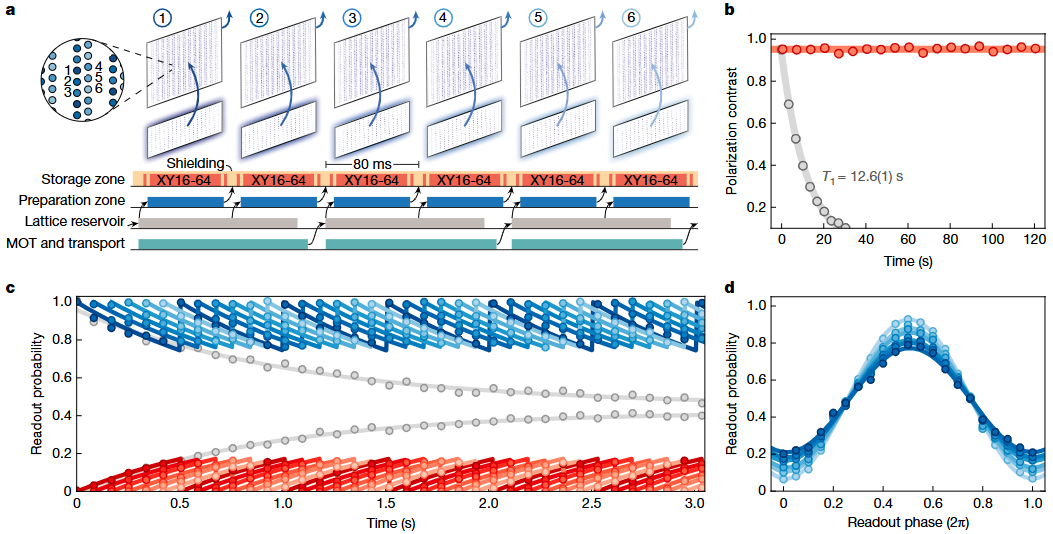 这三个区域的设计带来了一个非常重要的变化,那就是新原子的准备,不再需要等待旧系统结束。换句话说,系统不再是“准备好一切再启动”,而是变成了一个持续流动的过程:一边运行,一边有新的“组件”被生产出来。更关键的一步,是他们解决了“如何在不打扰系统的情况下补充原子”。传统方法需要使用激光冷却,而激光不可避免地会产生散射光,这些光会干扰甚至破坏已有的量子态。研究团队采取了一种更“克制”的方式:在加载原子时不使用额外的冷却光,而是让光镊直接从原子云中“抓取”原子,这依赖于随机重叠(Stochastic overlap)原子碰撞机制实现。这个看似细微的改变,实际上意义重大,因为它让“补充”这件事变得几乎“无声无息”,不会打断正在进行的量子演化。在这样的机制下,系统获得了稳定而高速的“补给能力”:每秒可以准备数万个新的量子比特,并持续送入系统。这就带来了一个本质上的变化,量子比特不再是“用完就没”的消耗品,而是成了可以不断流入系统的资源。更进一步的,量子计算也更趋于一个“在运行中不断更新、在更新中持续存在”的系统。前面的设计解决了“量子比特不够用”的问题,接下来还有另一个更隐蔽、也更关键的挑战:补原子的动作,会不会把正在运行的量子计算毁掉?量子态极其脆弱。在实验中,任何对原子的操作,尤其是成像、冷却、操控,几乎都离不开光,而光一旦被原子吸收和散射,就会像“噪声”一样,把精心维持的量子相干性迅速打乱。因此在传统方案里,“补原子”这件事,本身就是一种干扰。你越频繁地补,系统就越难保持稳定,这也是为什么过去的量子系统往往只能在“安静状态”下运行,一旦需要补充或重置,就必须整体停下来。这篇论文真正突破的地方是,研究团队让两件原本互相冲突的事情,第一次同时成立了:系统在被不断“修复”的同时,仍然保持量子相干,并持续运行。在保持存储量子比特相干性的同时进行连续操作:图源论文首先是空间上的隔离。制备区和存储区之间没有直接的光路连接,从结构上减少干扰。但仅靠这一点还远远不够,因为光总会以各种方式散射。我们可以把它理解为:研究人员用特定波长的激光,悄悄改变了存储区原子的“响应方式”,让它们对某些频率的光变得不再敏感。这样,即使在制备区进行成像、冷却等操作,产生的散射光也很难影响到这些已经在“工作”的量子比特。实验结果非常直观。如果没有这种屏蔽,只要在旁边进行一次成像操作,量子相干就会迅速崩溃,而加入屏蔽之后,相干时间几乎恢复到系统本来的水平。在此基础上,研究团队又加入了一层“动态保护”,通过精心设计的脉冲序列,不断抵消环境带来的扰动,让量子态维持得更久。此外,研究团队对“量子叠加态”的处理方式,同样令人印象深刻。叠加态比简单的“0 或 1”更脆弱,也更有价值。在系统需要替换某一部分原子时,研究人员会先把这些量子态暂时“转存”到一个更稳定的形式,完成替换后,再恢复回原本的叠加状态。整个过程就像是在运行中做一次“热备份”,然后再无缝切回,这在技术上被称为“相干映射到布居数”。结果是,在不断补充和替换的过程中,系统仍然有大约 90% 的时间保持在相干状态,这意味着量子计算不再需要“暂停维护”,而是可以在维护中继续进行。就像一台正在高速运转的机器,你可以在它运行时更换零件,还不会影响它正在执行的任务。在量子世界里,这一步极其困难,而这篇论文证明是可以做到的。如果只看表面,这项研究的成果已经足够惊艳:3000+ 量子比特、超过 2 小时的连续运行、每秒数万级别的补充能力。再往深探究,它还补上了量子计算发展过程中长期缺失的一环。一直以来,人们谈论量子计算,往往集中在几个指标:量子比特数量够不够多,量子门操作是否足够精确,算法是否能够展现优势。这些当然重要,但它们都隐含了一个前提,那就是系统必须能够稳定运行。量子计算真正的难点,除了“把系统做出来”,还有就是要让它在长时间内保持可用。尤其是在容错量子计算中,系统需要不断执行纠错循环,这就得经历成千上万、甚至更多轮操作,如果系统在计算过程中频繁中断,那么再精妙的设计也无从发挥。从这个角度看,这篇论文所解决的问题,并不在传统的性能指标之中,而是补上了量子计算走向实用所需的“运行机制”,让量子系统具备持续运行的能力。把量子计算看作一个完整系统,大致需要几块关键拼图:可靠的量子门操作、可扩展的硬件架构、成熟的纠错理论,以及能够支撑这些过程持续发生的运行能力。过去几年,前三块拼图已经逐渐清晰,但最后一块长期缺位。这项工作,恰恰填上了这一空白。论文中给出了一个非常关键的工程判断:按照当前的补充速率,系统已经可以支持大约一万个物理量子比特规模的持续运行,这正是许多容错方案开始变得可行的量级。当然,这项研究工作还无法直接等同于“通用量子计算已经实现”。从完整的工程路径来看,它更像是跨过了一道关键门槛,后面的路依然存在挑战。例如在中性原子体系中,双比特量子门的精度仍需进一步提升,才能满足严格的容错要求。再比如,真正意义上的逻辑量子比特(通过纠错编码得到的稳定信息单元),还没有在这一架构中完整展示。此外,这套系统本身的复杂度也不容忽视。从